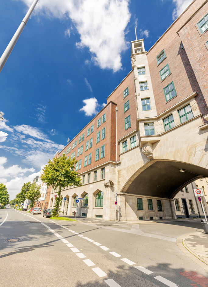 Nahe des Essener Hauptbahnhofes, „An der Reichsbank“, trumpft dieses denkmalgeschützte Gebäude mit seiner eindrucksvollen Sandstein- und Klinkerfassade.