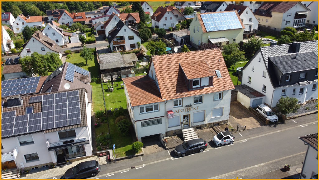 Dieses Wohn- und Geschäftshaus bietet Ihnen insgesamt rd. 315m² Fläche auf drei Etagen verteilt. Hier können Sie "Wohnen" und "Arbeiten" vereinen. Das Erdgeschoss wurde bis vor kurzem als Apotheke genutzt. Dort finden Sie einen Verkaufsraum, ein Büro, ein Labor, ein WC und Abstellfläche. Die Räume können aber auch als Büro, Praxis, oder Wohnraum umgenutzt werden. Das Obergeschoss verfügt über rund 120m² Wohnfläche und gliedert sich auf in ein großes Wohnzimmer, ein Esszimmer, zwei Schlafzimmer sowie eine Küche und ein Badezimmer mit Wanne und WC. Das Dachgeschoss bietet Ihnen vier Schlafzimmer und ein weiteres Badezimmer mit Dusche und WC aus den 80er Jahren. Im Kellergeschoss des Hauses finden Sie getrennt über 2 Zugänge Abstellräume, einen Heizungsraum und das Öllager. Für Ihre PKW stehen Ihnen zwei Außenstellplätze und eine Garage bereit.