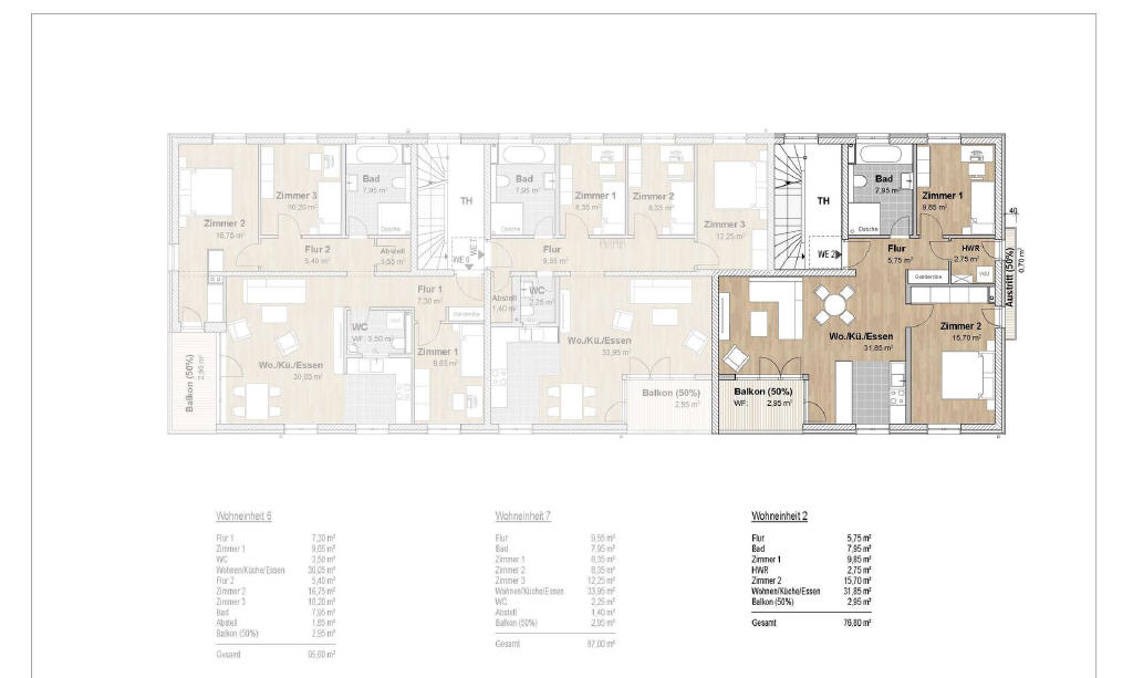 Dank der variantenreichen Grundrissgestaltung können Sie Ihre Wohnung nach eigenen Wünschen anpassen und den Wohnraum ideal auf Ihre Bedürfnisse abstimmen. In den meisten Bädern erwartet Sie eine bodengleiche Dusche und eine Badewanne, um Ihren Start in den Tag angenehm zu gestalten. Der hohe Wohnkomfort wird durch hochwertige Laminat- und Vinylböden sowie Fußbodenheizung unterstützt. In den Küchen und Bädern wurden Fliesen verlegt, während Parkettböden auf Wunsch gegen Aufpreis möglich sind.