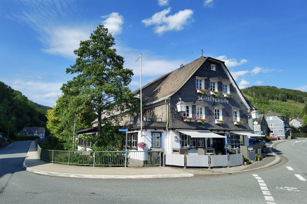 Das Hotel befindet sich im malerischen Ortsteil Oberkirchen der Stadt Schmallenberg, Nordrhein-Westfalen. Das historische, mit Schiefer verkleidete Gebäude aus dem Jahr 1749 liegt idyllisch im Lennetal, direkt am Ufer des Flüsschens Lenne. Die Umgebung zeichnet sich durch eine ruhige, naturnahe Atmosphäre aus, die sich ideal für Erholungssuchende eignet. In unmittelbarer Nähe finden Sie zahlreiche Wander- und Radwege, die die reizvolle Landschaft des Sauerlands erschließen. Zudem sind Sehenswürdigkeiten wie ein lokaler Kunstschmied fußläufig erreichbar. Die nächstgelegene größere Stadt ist Schmallenberg, etwa 6 km entfernt, wo Einkaufsmöglichkeiten und kulturelle Angebote zur Verfügung stehen.