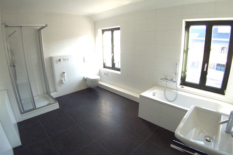 Das außergewöhnlich große und exklusive Badezimmer ist elegant in Weiß mit dunkel kontrastierender großer Bodenkeramik gestaltet. Ein zusätzlicher formschöner Handtuchheizkörper ist inbegriffen. Im Badezimmer befindet sich praktischerweise der Anschluss für die Waschmaschine.