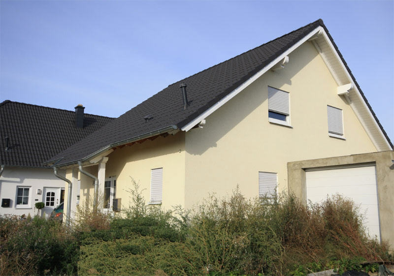 BESCHREIBUNG Das bildhübsche junge Eigenheim wurde vor rund 6 Jahren neu erbaut. Die verputzte Fassade hat einen freundlich-einladenden vanillegelben Anstrich, der einen gelungenen Kontrast zu dem dunklen Satteldach bildet. Die breite Schleppgaube setzt einen aparten architektonischen Akzent.