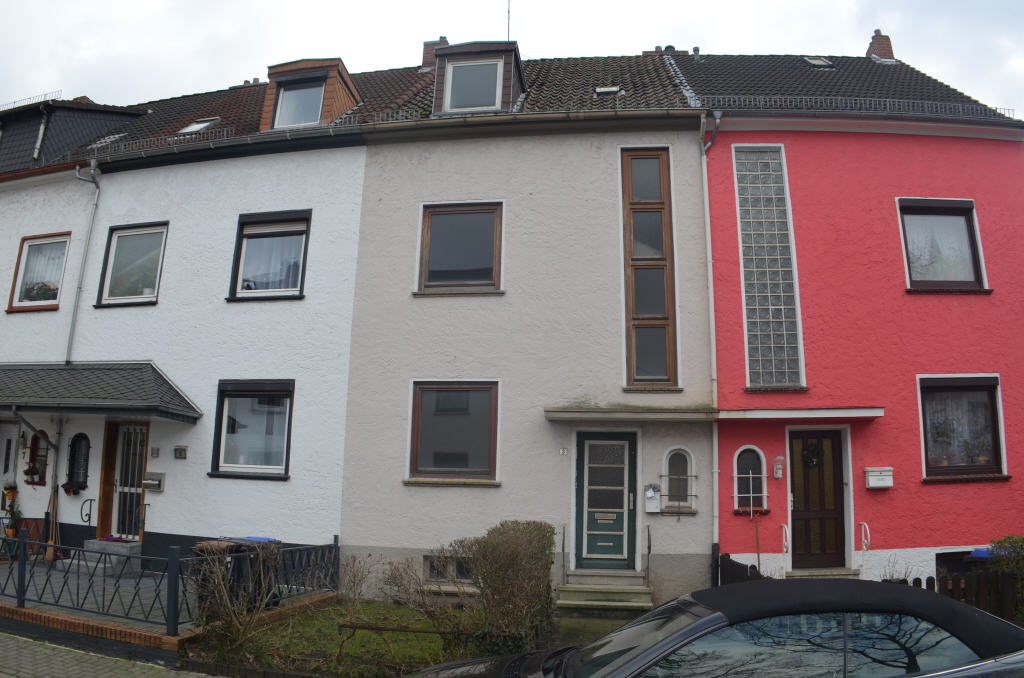 Das Reihenmittelhaus, Art Bremer Haus, gilt als Einheit einer im Jahre 1930 entstandenen Reihenhaussiedlung und wurde von bis zu drei Parteien bewohnt. Allerdings steht die Immobilie z. Zt. leer und müsste renoviert werden. Über Erd- Ober- und Dachgeschoss verteilen sich fünf Räume plus jeweils Küche und kleines Bad. Wie in früheren Zeiten üblich befindet sich eine Dusche im Keller. Die großzügigen Räumlichkeiten bieten jedoch allerhand Gestaltungsmöglichkeiten und auch die Einbringung von Bädern auf jeder Ebenen wäre durchführbar. Sollte die Nutzung als Eigenheim bevorzugt werden, könnte aus diesem Haus eine urgemütliche Einheit entstehen. Als Heizung empfehlen wir die Installation einer Gasheizung im Keller. Auch müsste die Stromversorgung erneuert werden sowie sämtliche Fenster. Die gepflegten Häuser in der Nachbarschaft zeigen deutlich auf, was hier möglich ist.