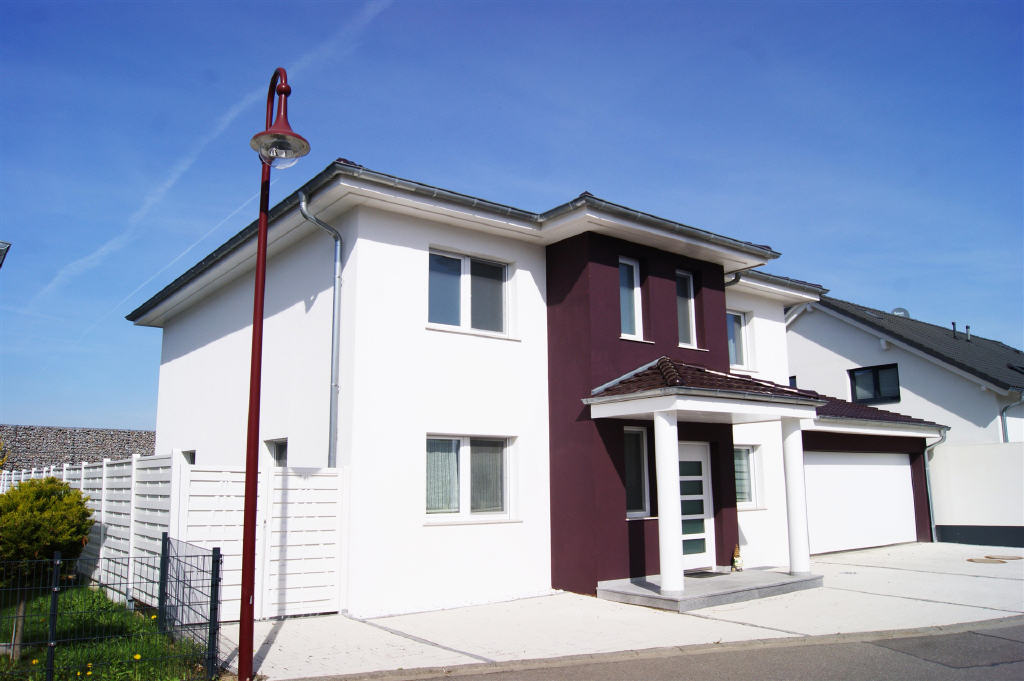 Das zum Verkauf angebotene großzügige, repräsentative freistehende Einfamilienwohnhaus befindet sich in guter, zentraler Wohnlage eines ca. 2011 entstandenen Neubaugebietes in der Winzergemeinde Auggen. Das traumhafte Anwesen besticht durch sein stilvolles Design, die Großzügigkeit und Anzahl der Zimmer, moderne Farbakzente, durchdachte Grundrisse, dem Garten sowie der Doppelgarage. Im EG werden Sie von dem hellen Eingangsbereich empfangen. Vom Flur gelangen Sie in das Büro, dem Flur weiter folgend zur Garderobe, dem Gäste-Bad sowie zum sehr lichtdurchflutenden, großzügigen Wohn-/Essbereich mit offener moderner Küche. Diese ist ausgestattet mit Markengeräten der Fa. Siemens und im Kaufpreis enthalten. Die großzügige mit hellem Steingut belegte Terrasse ist vom Wohnzimmer aus zugänglich. Hier ist für entsprechenden Sonnenschutz mit zwei Markisen gesorgt. Über das Treppenhaus mit massiver Betontreppe, die mit Granitstufen und hochwertigem Edelstahlgeländer versehen ist, erreichen Sie das OG. Die hier vorhandenen 3 Zimmer und das Tageslichtbad sind sehr großzügig und hell. Das ansprechende Wohlfühlbad ist mit einem Doppelwaschtisch, WC, einer über die Ecke eingebauten Badewanne sowie einer geräumigen, bodentiefe Dusche mit Glaskabine und Regenwalddusche ausgestattet. Zusätzlich ist ein Handtuchheizkörper vorhanden. Im UG befinden sich eine 2 Zimmer Duschbad Wohnung bzw. Büro, 2 Kellerräume sowie der Heizungsraum. Sowohl hier als auch im Gäste Bad im EG können Sie Ihre individuellen Vorstellungen bei der Restfertigstellung umsetzen. Alle zu Wohnzwecken ausgebauten Räume / Zimmer / Bäder werden über die Fußbodenheizung beheizt. Auch für die Unterbringung Ihrer Autos ist durch die Doppelgarage mit elektrischen Sektionaltor gesorgt. Von hier gelangen Sie über ein weiteres Sektionaltor auf einen weiteren Freisitz im Gartenbereich sowie dem Garten. Die Bewässerung Ihrer Pflanzen und des Gartens erfolgt ökologisch über Regenwasser aus der Zisterne.