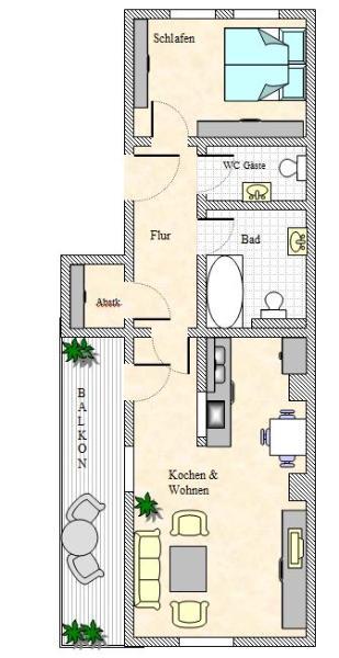 Die Wohnung verfügt über ein großes Wohnzimmer mit offener Küche , das Bad mit Wanne, WC & Waschtisch, ein separates WC mit Waschtisch, das Schlafzimmer, eine Abstellkammer sowie einen Balkon