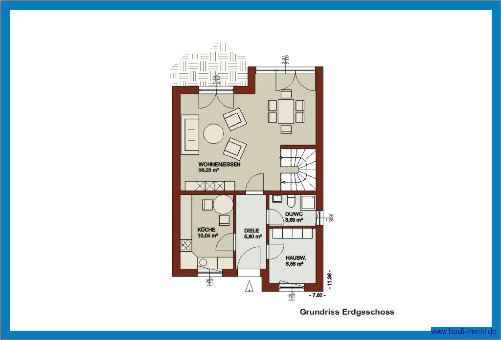 Besonders reizvoll ist es, steigenden Platzbedarf mit kompakten Abmessungen des Hauses zu kombinieren. Das Massivhaus mit 121qm ist ein Paradebeispiel dafür - zwei Vorsprünge sorgen für einen optischen Kick, - das Ergeschoß verfügt über einen großen Wohn-Essbereich mit Abstellraum, - im Dachgeschoss haben drei Kinder genügend Raum zum Wohlfühlen, - und bei zusätzlichem Platzbedarf besteht im Spitzboden noch eine Ausbaureserve mit knapp 25 Quadratmetern. Mit seiner Hausbreite von 7,62m ist dieses Haus ideal für schmale Grundstücke. Genau so bringt man viel Platz in kompakte Abmessungen!