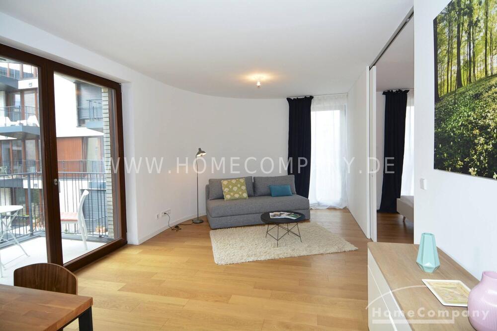 Neubauwohnung in Berlin Prenzlauer Berg. Sehr moderne, sonnige, und ruhige Stadtwohnung im 2.OG zum begrünten, großen Innenhof in 2018 fertiggestellter Wohnanlage (Gotland) in süd-westl. Ausrichtung. Möbliert mit stilvollen, hochwertigen Möbeln und Einbauküche mit Spülmaschine. Parkettboden in kompletter Wohnung. Bodentiefe Fenster, die viel Licht geben, großer Balkon, Fußbodenheizung.