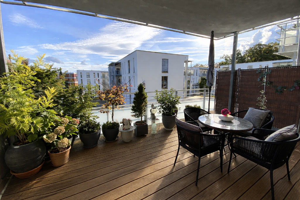 Der Wohn- und Essbereich ist großzügig geschnitten und bietet Zugang zum Balkon mit Blick in die ruhige Umgebung. Die offene Küche ist mit einer modernen Einbauküche ausgestattet. Ergänzend zum Badezimmer mit bodengleicher Dusche steht ein separates Gäste-WC zur Verfügung. Die gesamte Wohnung ist mit Fußbodenheizung ausgestattet, was für ein gleichmäßiges Raumklima sorgt und gleichzeitig pflegeleicht ist.