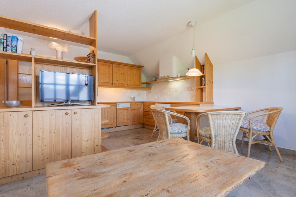 Über den Flur gelangen Sie in den Wohn-Koch-Essbereich mit der schönen rustikalen Einbauküche. Weiter geht es in Schlafzimmer – auch hier sind Massivholzmöbel vorhanden. Das Tageslichtduschbad hat einen moderieren Touch und bietet auch ausreichend Platz. Die Wohnung ist perfekt für die Bedürfnisse eines Single Haushalts ausgestattet.