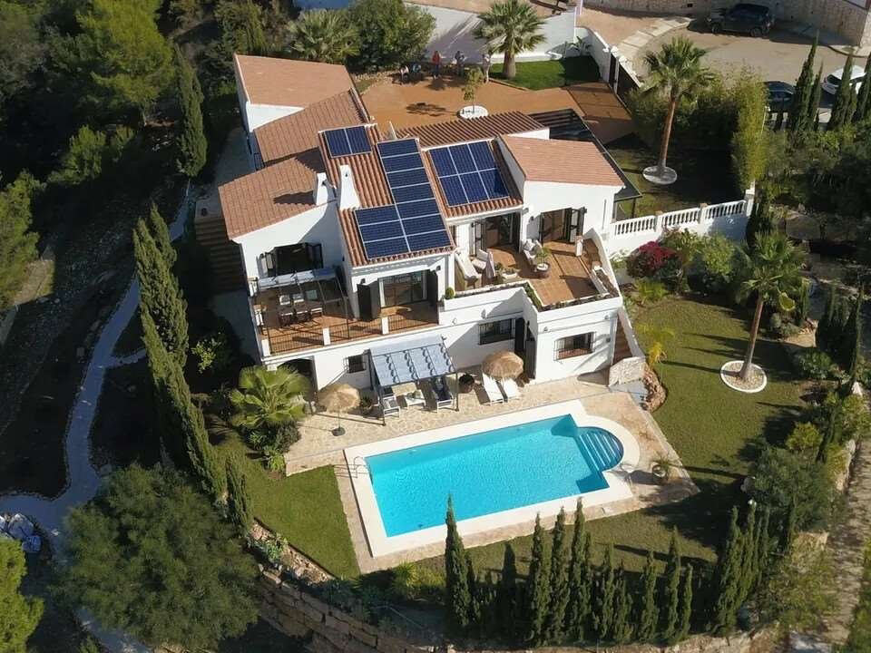 Großes Wohnzimmer mit offenem Kamin, offen verbunden mit Arbeits- und Esszimmer. Glasfaser-Internet, IPTV und Sat-TV. Offene Türen zur Terrasse. Zentrale Klimaanlage/Heizung und Back-up-Pelletofen. Video-Türklingel.